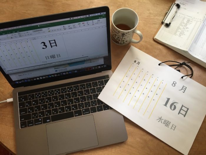 月日の概念を身につけるべく、リハビリのスタッフが手書きの日めくりを15日まで作ってくれたので、エクセルのカレンダーを利用して、日めくりを手作りする。とりあえず8月16日から9月3日まで。